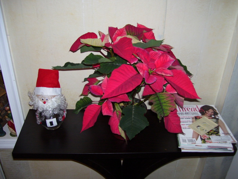 Last year was the first year our Christmas cactus bloomed and this year it is covered with flowers again. We have had this plant for at least 10 years and it finally bloomed. It is such a beautiful display but the picture doesn't do it justice. Meanwhile our Poinsettia we bought this year is hanging out next to Santa.