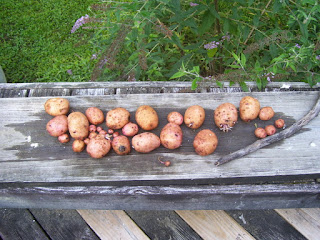 This year has been great for Red Potatoes. We planted seed potatoes in four 20 gallon containers and are harvesting a great crop. These are the potatoes from the third container . It's quantity and quality are similar to containers one and two. We are getting about five pounds of potatoes from each container. Meanwhile the Orange flowers are blooming like crazy in front of the shed again. They create a nice color display in front of the Elephant Ears.