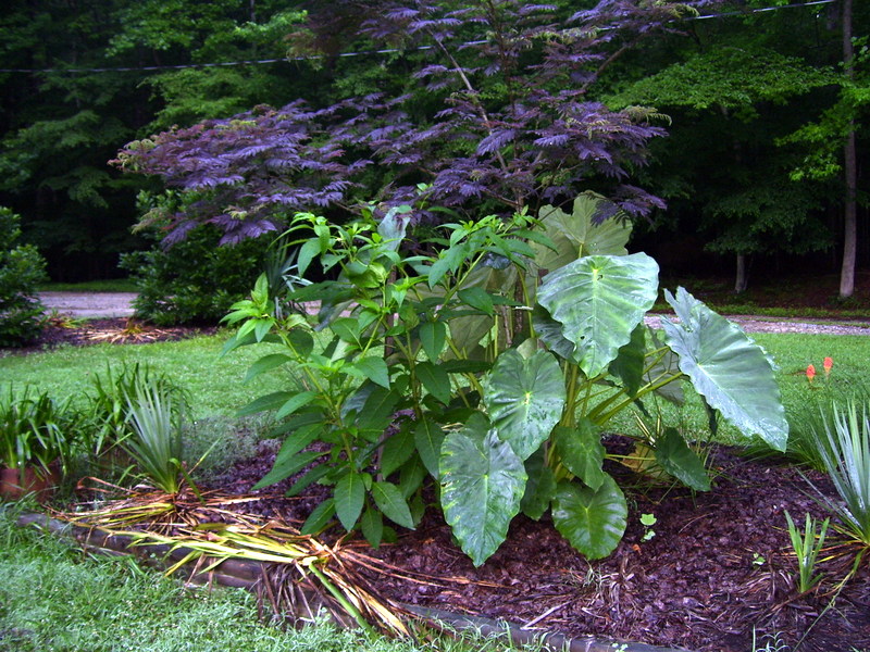The Chocolate Chip Mimosa tree we moved to the middle of the front yard two years ago has taken on quite a sculptural appearance with long spreading branches. The location has proven to be perfect for giant Elephant Ear plants to thrive. They fit in nicely with the tall Mimosa and smaller plants around them.