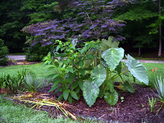 The Elephant Ears around the Mimosa Tree are now over 8 feet tall with huge leaves. In the first picture, you can see the giant stems coming out of the ground. One of the interesting things about these is they were not planned. There were some Elephant Ears around the Mimosa in it's old location. We thought we pulled out all the Elephant Ear bulbs when moving the Mimosa but obviously we missed some and they have grown like crazy. It must be the perfect location since none of our other Elephant Ears are this big.